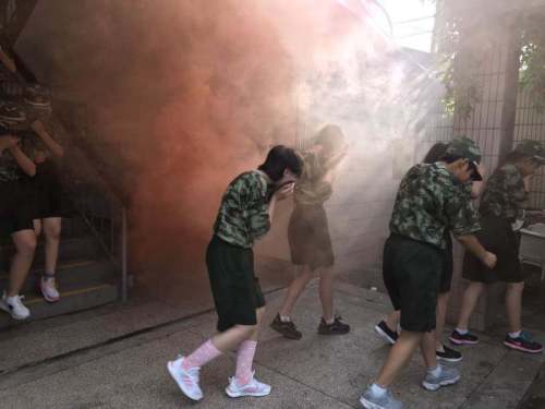 上午7时,预先设置在楼道、走廊的发烟罐散发出橙色烟雾,模拟灾情发生。学校防空警报拉响,提前入校开展军训的高一年级各班同学在正、副班主任的组织下兵分四路紧张有序地从教室疏散到大操场。