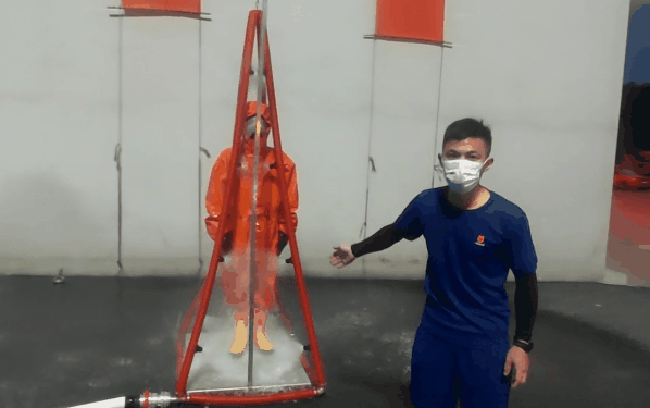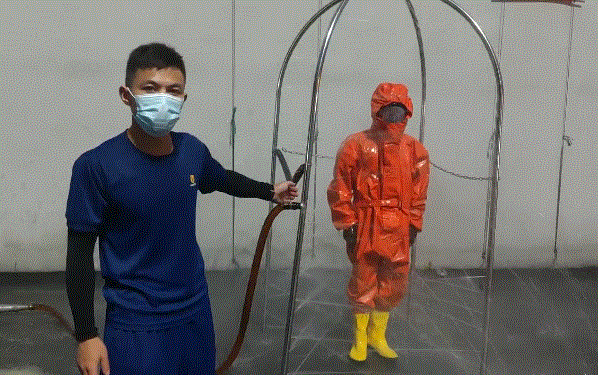 扬州支队江都大队还设计制作了360度洗消喷淋装置和便携式洗消喷淋器,主要用于人员、物体洗消。