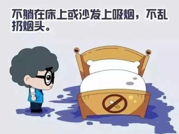 易燃易爆物品切勿带进酒店和房间,不躺在床上或沙发上吸烟,不乱扔烟头。燃烧的烟头温度极高,容易引燃棉、布制品导致火灾。