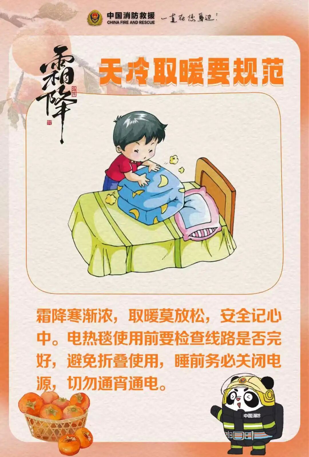 冷空气持续发力,今天我们迎来秋季最后一个节气——霜降。这一时节,草木凝霜,万物敛藏。随着寒意渐浓,秋天“体验卡”即将到期,“凉爽模式”向“寒冷模式”切换,瑟瑟发抖的“怕冷星”人,纷纷拿出自己的“续命”妙招:穿上一层又一层保暖秋裤,贴上暖宝宝、打开“小太阳”,在厨房煲一盅咕嘟咕嘟的热汤……
